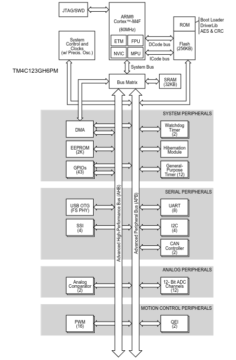 TM4c123Gh6pm 是嵌入ARM Cortex-M4F处理器的开发板,处理器频率为80MHZ(通过PLL配置后),配有256k flash ROM,32k RAM,2k EEPROM,还包括USB主机,OTG连接,睡眠模块、PWM和其他外围设备。