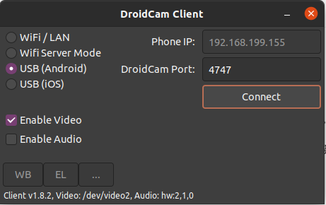 接下来,打开 droidcam 客户端,选择 USB 连接模式:
