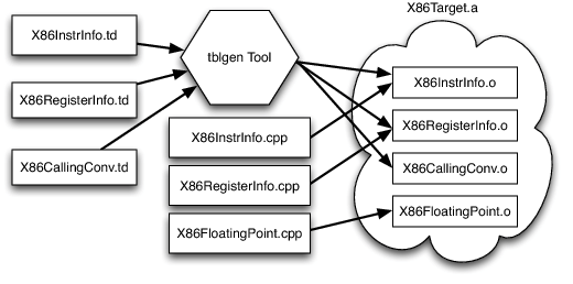 从上图可知,目标描述被 tblgen生成多个源片段,这些源片段可以被其他工具或代码使用。