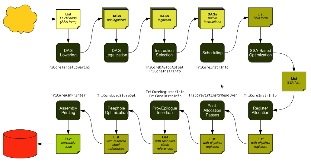 在 LLVM 项目介绍 中我们说 LLVM 的后端代码生成器是由 一系列 Pass 组成的,本篇文章会进一步描述一些重要的 Pass:例如指令选择及其所使用的目标描述语言(.td文件)的细节。如果需要一个新的后端,在大多数情况下,我们都可以通过移植已经存在的后端来完成。