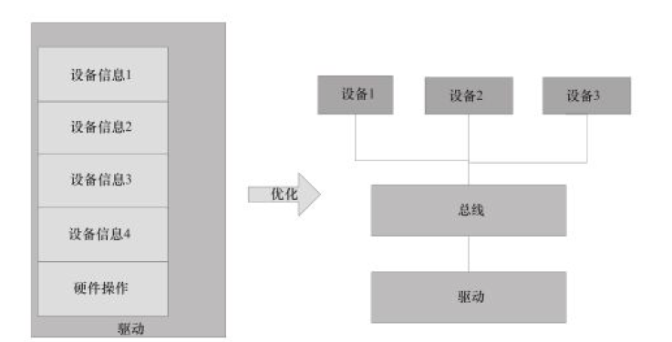 BSP和驱动。在BSP中定义platform设备和设备所使用的资源、设备的具体配置信息,而在驱动中,只需要通过调用API去获取资源和数据。使得驱动具有更好的可扩展性和跨平台性。 - 让一个驱动支持多个设备实例。