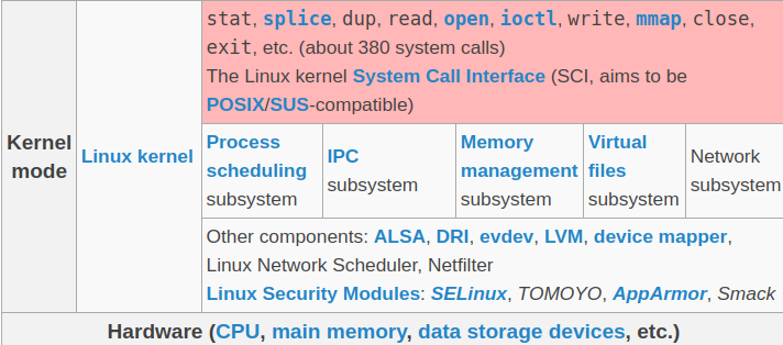 类Unix内核区分内核态和用户态。用户进程几乎不与硬件资源直接交互,而是使用系统调用进入内核态请求资源。