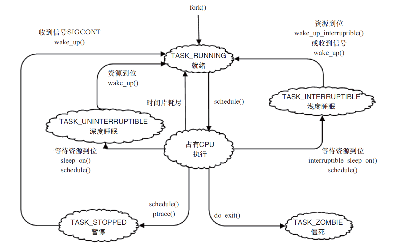 对于处于等待状态中的进程,内核将它放入被等待事件的等待队列中,并可以在未来条件满足时唤醒进程。等待队列由双向链表实现。