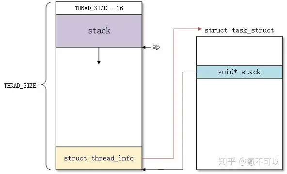 因此,我们可以获得当前进程内核栈的sp寄存器存储的地址时,根据THREAD_SIZE对齐就可以获取thread_info结构的基地址。