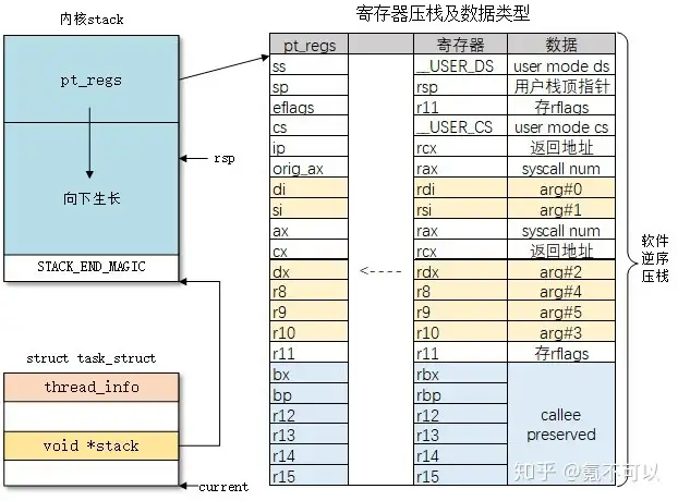 struct pt_regs成员一一对应(顺序固定且是倒序)。