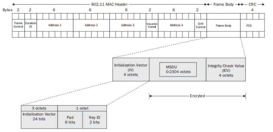 - 密文逆向分析:根据加密流程,可以知道,当获取到两段密文 S1 和 S2 的情况下,即使不知道密钥流,也可以获得对应两个明文的异或结果。换句话说,在这种情况下,一旦知道了 S1 的明文,立即可以推导出 S2 的明文,反之亦然。因此,WEP 引入了 IV,这样每次加密时,即使密钥相同,IV 不同,也能产生不同的密钥流。