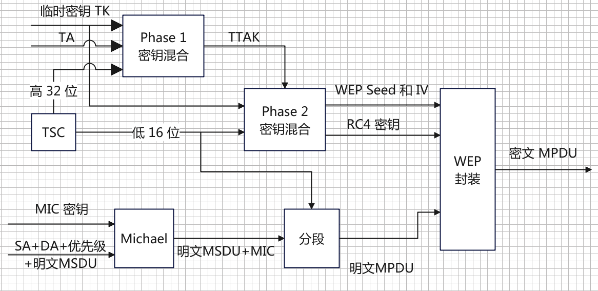 WPA 引入了临时密钥完整性协议 TKIP,相对 WEP,TKIP 在安全方面有两点增强:一是增加了密钥强度(但仍然使用 RC4 算法),从 40 位增加到 128 位;二是 MIC(Michael 算法) 代替 CRC 作为完整性校验算法。