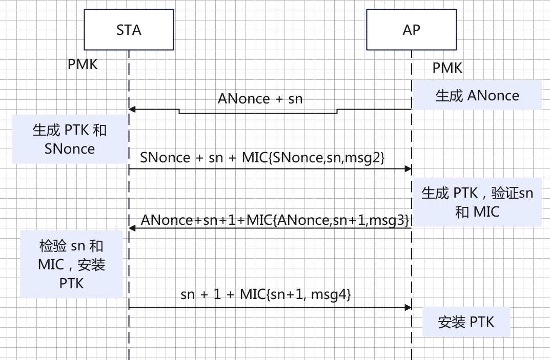 PMK 由 AP 的 SSID 和 Wi-Fi 口令生成。由 PMK、SNonce、Anonce、AP 和 STA 的 MAC 地址等作为输入,生成 PTK,再由 PTK 生成 MIC。MIC 在上述握手过程中,是最重要的身份识别码 。