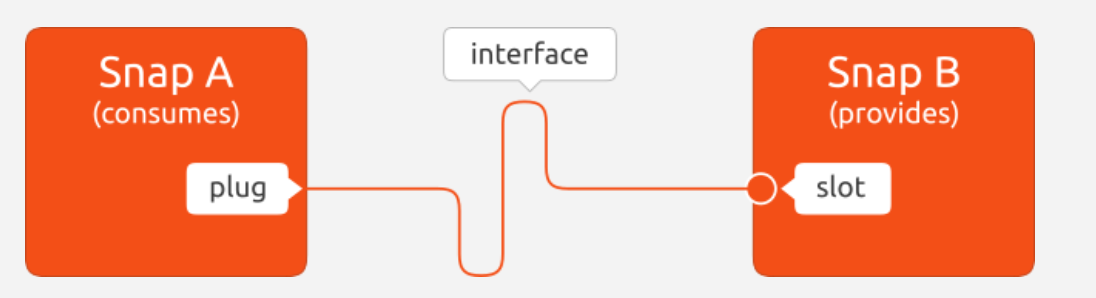 接口(interface)用于对 Snap 进行隔离限制,包括 Snap 应该做什么,不应该做什么,更重要的是对外部资源(如网络、文件系统、声卡等)进行访问控制。Snap 可以请求某个接口,也可以提供某个接口,因此接口实际上也描述了系统中 Snap 之间的依赖关系和数据交互方式。