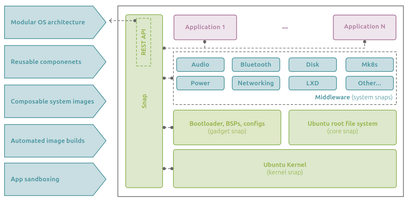 - Core snap: 标准的或者定制的 Ubuntu 根文件系统。